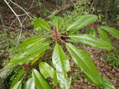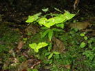 細い登山道を進む 13時45分 落葉の積もる登山道を軽快に下って行く。油断すると濡れた落葉で滑ってしまうので注意だ。 ユズリハ |