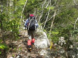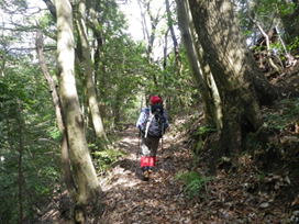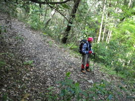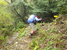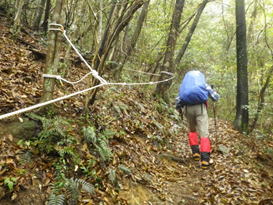 急登のロープに感謝 9時11分 けやき沢で休憩を終え登山道に取り付くが、ここから勾配が増し、おまけに先程までの雨で落ち葉も濡れているのでズルズルと滑って非常に歩き難い。 日頃から奥深い登山道を整備されている方々に頭が下がります。 それにしても誰にも会わないこの登山道、「雪が降り積もった時に一人で黙々と歩くと何とも言えないよ」と言ったH師匠の言葉が忘れられない。 |