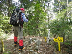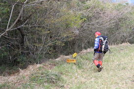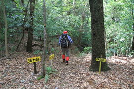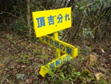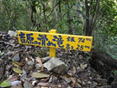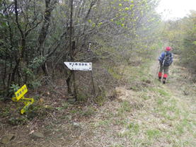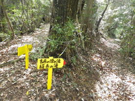 10、金満尾根への分岐 13時37分 足下の黄色い標識から森に入って行く。 金満尾根は英彦山秋の峰入り道である。 分かり易い表示 |