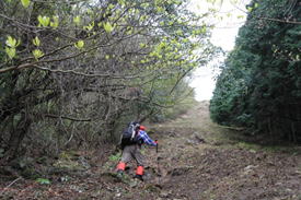 赤牟田の辻の急登に挑む 11時54分 標高差150mの急坂。 一直線に伸びる登山道を必死で上るのだが、上を見上げると気が遠くなる。 焦らずゆっくりペースを守って上ることが大切だ! 右は植林帯、左は自然林で左右の様相が全く異なっている。 |