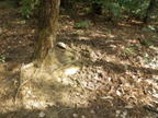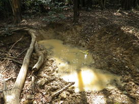 イノシシのヌタ場 14時42分 水たまりが2か所あった。そこはイノシシのお風呂だった。体に着いたダニやシラミを泥水の中で転がりながらこすりとる場所である。 ダニがいるかも? |