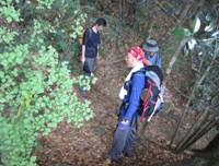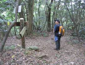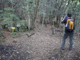 福智平からの下り 11時18分 登山道の途中で右への細い道に入り、樹林帯の中を下って行く。その内、本道に合流する。