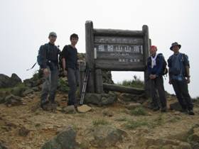 山頂でコース談議 10時47分 時折ガスが晴れる。周囲の山を見ながら、地図を広げてコースの確認をする。