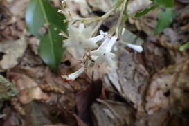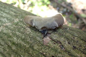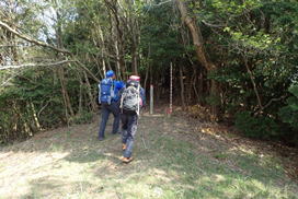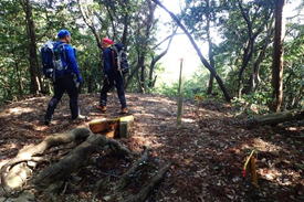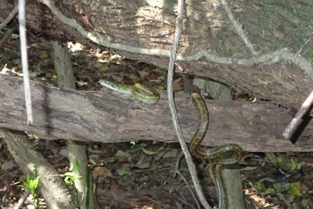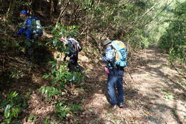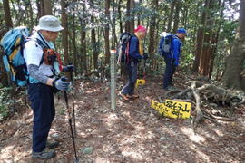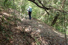 先頭を歩いていたK高さんが、知らずにまたいだのはシマヘビだった。どうやら登山道の日当たりのいい場所を見つけてお昼寝をしていたのだろう。シマヘビもビックリして林の中へスルスルと逃げ込み木登りを始めた。ペロペロと出す舌はなんと気味が悪いことか・・・。 |
