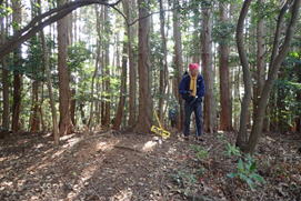 | 林道を進んでいくと広場に出た。広場には古びた作業小屋があった。H師匠によると、この小屋は26年程前に建てられたと言う。現在はもう使われていないようだが、当時は林業従事者の方々が作業や休憩に利用していたらしい。 |