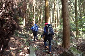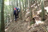 | 二つ目の沢を渡渉した後は、急斜面をトラバースすることになる。徐々に高度を上げ、左を見下ろすとちょっと怖い。ズルズルと滑って歩き難い場所もあり、慎重に歩を進め上って行く。 |