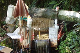 ![]() 岩の下の穴から少量の水が湧き出ている。 湧き出る光景はなかなか見ることは出来ないそうだが、我々は本当にラッキーだった。 このような湧き出し口が数ケ所あり、その水をパイプに集めて湧水量を調べている。 ![]() 右の流れは吉原川の支流なので、間歇冷泉とは別物で関係がない。湧水はヨコになった太いパイプの上方の数ケ所の穴から出ている。 ![]() 集水観測箱の下部から流れ出る湧水 水量は、メモリのようになっている赤いテープが目安となっている。多い時は下から三番目のテープまで増えるとのことだった。 |