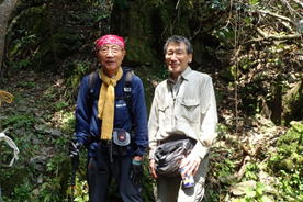 間歇冷泉を下る 12時33分 「熊本地震の直後はこの湧水が1週間ほど濁っていた。」「湧水の記録は1000回以上のデータを集めている。」「そのデータを元に分析すると色々と解ってくる。」等、さすが研究者、その地道な努力に敬服・脱帽である。 F先生とのお話もなかなか尽きないが、記念撮影をして下山することにした。 |