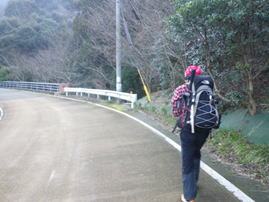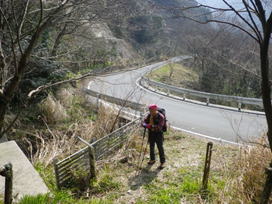 ガードレールの裏側から 7時50分 車で走って来た周回道路を戻るようにして登山口に向かう。 「ぜぜり橋」手前のガードレールの裏側から登山道が伸びている。 サル出没に注意! |