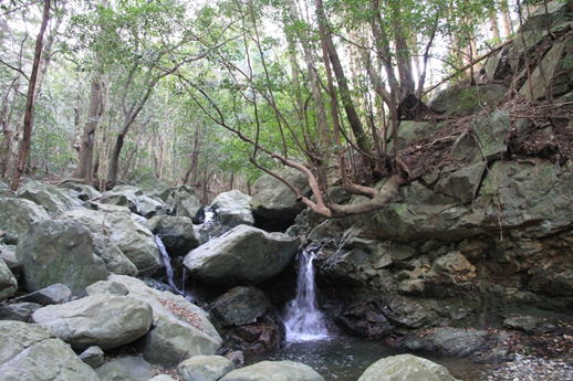 川に沿ってガレ場を上る 8時54分 今日は気温が高い。それに加えて上り一辺倒の登山道を30分も歩いていると、気が付くと帽子のひさしからポタポタと汗が落ちていた。 このコースを上る途中のガレ場や急登は危険を感じる場所が所々出てくる。 雨など降ると当然それ以上に危険度は増すに違いない。中級者以上と言われるこの登山道の所以が徐々にわかってきた。 |