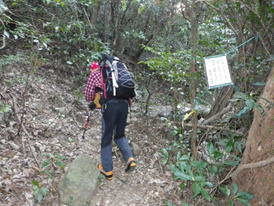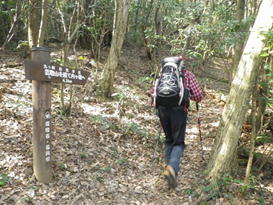 三叉路の分岐 11時21分 左は内ヶ磯へ下る道になるが、この三叉路から目標である右の雲取山方面に進む。山頂を踏んだ後はまたここまで戻ってくる。 標識を確認 |