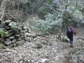 炭焼き窯跡を通過 8時49分 こんな急峻な場所にも炭焼き小屋があったのか! ちょっと驚きだ! 石組みが残る |