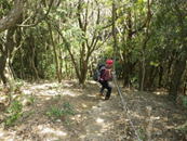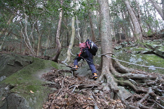 大きなイチイガシの木 11時24分 突然大きな木が目の前に現れた。雲取山の主かもしれない。これより一旦鞍部に下るが、その後はロープが張られた急登を一気に上る。 急登に喘ぐ |