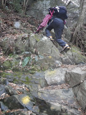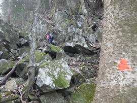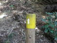 倒木を跨いで進む 12時56分 先程の分岐からは道が更に難路となった。斜面は崩壊気味で危険な道が出てくる。コース上には赤と黄色の番号のついた杭も出てくる。当初は綺麗に整備されていたのだろう。 |
