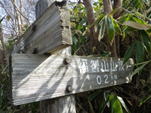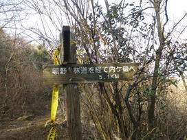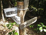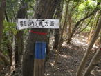 内ヶ磯方面への分岐 12時46分 五合目の小さな表示を過ぎた所で、壊れかけたベンチが現れた。そのすぐ下に分岐表示があり、内ヶ磯方面を確認して右に進んだ。 右の内ヶ磯方面へ |