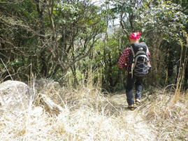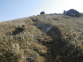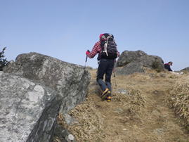 山頂まで最後の上り 9時44分 眩しい太陽に向かって山頂に向かう。お天気は上々だが、残念なことに黄砂が飛来して下界は霞んでよく見えない。風は強い。 鳥野神社上宮 |