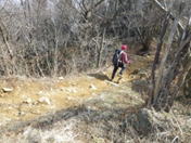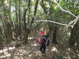 荒れた登山道を下る 12時27分 三叉路からの登山道もあまり人が歩いてない様子で、踏み跡も薄い。しっかりと赤テープを辿って歩く。下り坂の勾配は急で滑りやすい。油断をすると転倒してしまいそうだった。 登山道の整備もそれほどされていなく、倒木を越えて歩く場面も出てくる。荒れた道に苦労しながらも、H師匠のリードでペース良く淡々と下山していった。初めて歩く人は用心だ! |