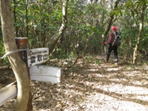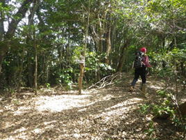 左のルートで山頂を目指す 9時35分 先程の分岐から3分程進むと九州自然歩道の説明版に行き当たる。道はT字路になっていて左右どちらの道でも山頂に通じている。 左に進んだ |