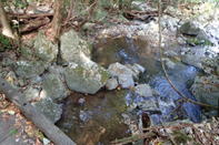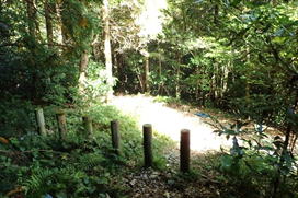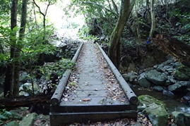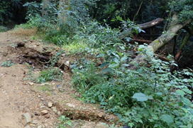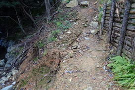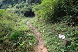 車両通行止めの杭をすり抜ける 7時50分 これより本格的な登山道。最近は土が流れて道が細く悪くなっている。危険な場所もあるので、崖から川に落ちないように注意! |