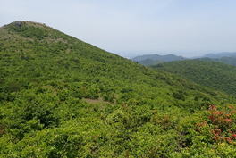 8、鈴ヶ岩屋(すずがいわや) 11時22分 真っ赤なヤマツツジの向こうは福智山山頂 |