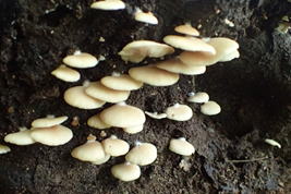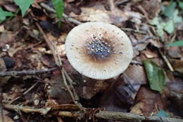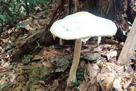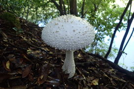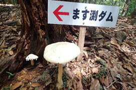 大きな白いキノコが標識の前に陣取っている・・・・・傘の直径、20センチはありそうだった。 |