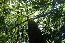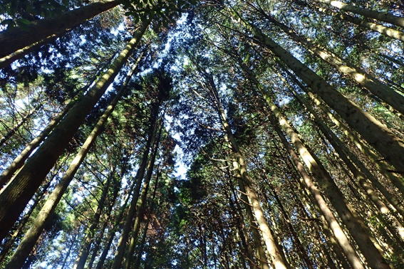 登山道に入り上を見上げる 7時37分 森に朝日が差し込み鳥の囀りも聞こえてきた |