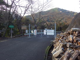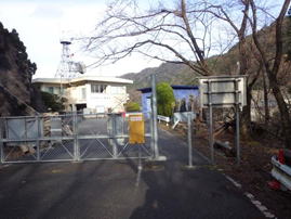車両通行止めゲートを越える 15時05分 このゲートの向こうに「ます淵ダム管理所」が見えている。堰堤もすぐそこだ。 ここから堰堤 |