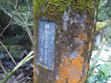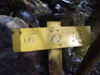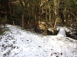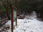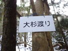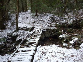 11、大杉渡り 13時19分 沢の部分を除いて一面雪に覆われている。この沢は水量が少なく、気楽に渡ることが出来る。この先のベンチでアイゼンを外した。 小さなプレート |
