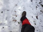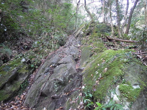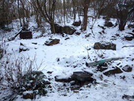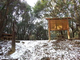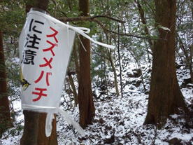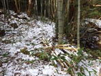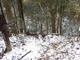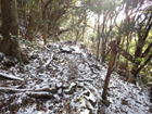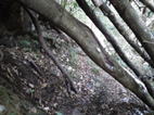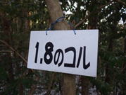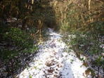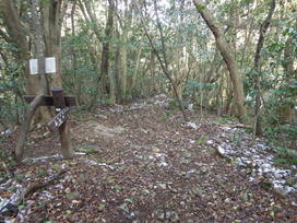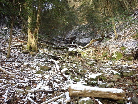アカガシ林を歩いていると・・・ 13時37分 1.8のコルに到着する寸前、左下の谷でガサガサと音がした。樹木の間から谷底を見ると、真っ黒で大きなイノシシが三頭。小走りで林の中へ逃げて行くのが見えた。写真を撮ろうとカメラを構えたが撮影は無理だった。 雪の中、谷を走る黒いイノシシの姿はちょっと異様に感じた。登山道の方に上って来ないだろうかと、内心焦った。 |