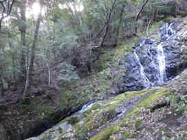 分岐に出会う 右へ 8時48分 「一の滝」を見終わるとすぐ左に分岐がある。ここから右に進めば、鎖場を経て二の滝へ、左の迂回路に進めば、三の滝の手前に出る。 右の鎖場へ |