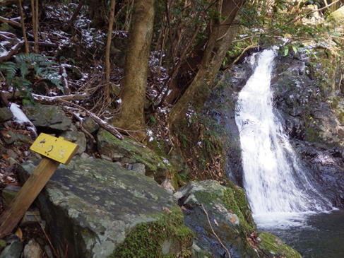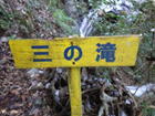 3、七重の滝(一の滝〜七の滝) 8時47分 滝見橋を渡ると一の滝が待っている。いつものように流れは激しいようだ!黄色の標識は風雨にさらされ痛んでいる。 一の滝 |