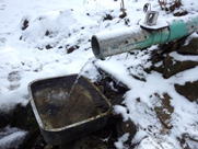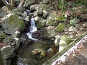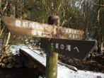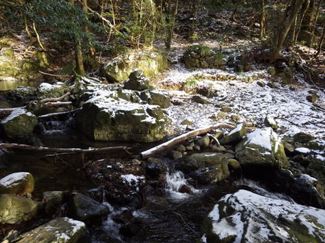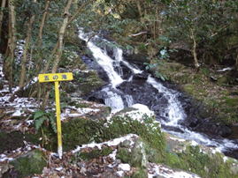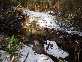 7、たぬき水 11時20分 ここも辺り一面真っ白。チョロチョロと水が流れ出る。飲まずに先へと進む。 寒々しい |