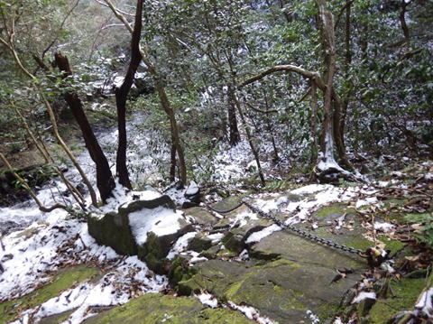 鎖場を上り、振り返る 9時21分 滑り易くて注意! とても寒々しい。 |