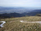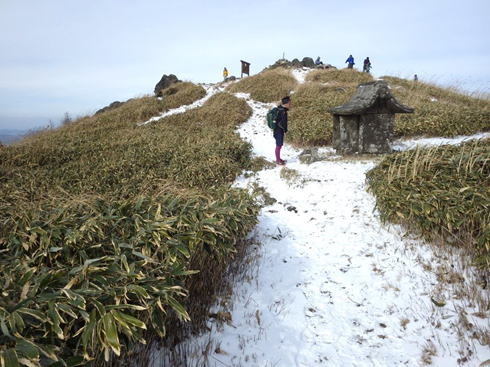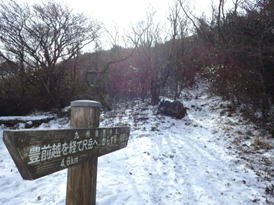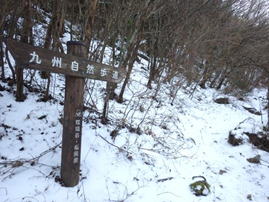 福智山山頂 登山道には雪が残り、登山道が白く浮かび上がる。