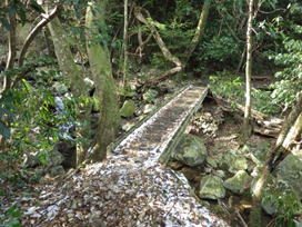 またまた橋が倒壊 9時53分 山瀬に到着する寸前の川にさしかかったが、ここの橋も朽ち落ちている。七重の滝コースの橋はことごとく倒壊している。 左に迂回路 |