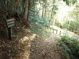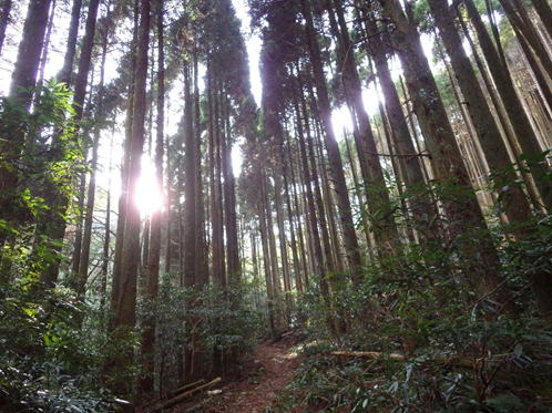 | 14時17分 杉木立の中に太陽光。 気分よく下って行く |