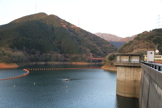 美しいダム湖にうっとり 14時32分 赤い橋の上から青く輝く湖面を見つめる。 のんびり |