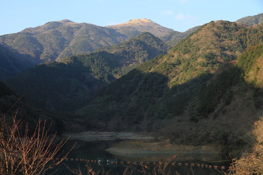 早朝の鱒渕ダム 7時14分 朝日に照らされ山肌がほのかに赤く染まっている |