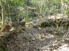 炭焼き窯跡の石組み 9時27分 昭和30年代までは炭焼きが行われていたようだ。川のすぐ横に石が組まれている。 豆蔦が綺麗だ |