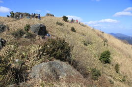 ポカポカの山頂風景 12時12分 登山者が続々山頂に上がってくる。グループ、ご夫婦、親子連れ、単独行などそれぞれ皆さんご満悦。 ところが赤牟田の辻方面からの一本道を突然バイクが3台爆音を轟かせて上ってきた。見ると、ぬかるみでスタックして立ち往生している。バイクはとうとう諦めて戻って行ったが、登山道はボロボロ。悲しい出来事だった。 |