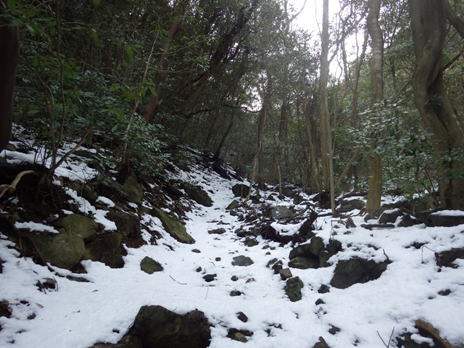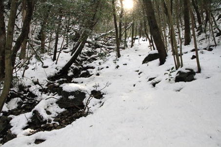 このような雪の中、アイゼンを装着するタイミングを考えながら歩いていたのだが、実は意外と歩き易かった。結局この時点ではまだアイゼンを付けていない。 |