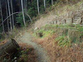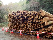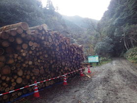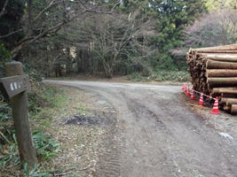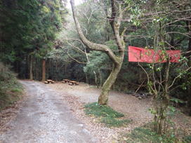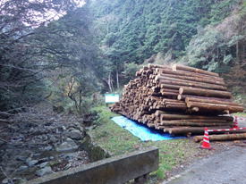 10、福智山登山口 14時20分 材木の置いてある登山口に到着。ここから右に曲がって、赤い「ます渕橋」を目指す。 間引きの材木 |