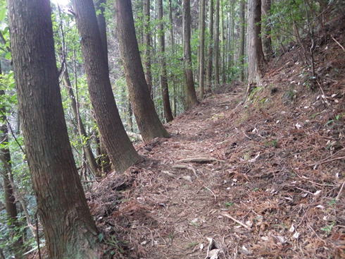 林道出会い 14時13分 ホッテ谷分れからの下りは、疲れも感じない快適なウォーキングである。小さな沢を何度か渡り、緩やかな斜面を気分よく歩いて、いつの間にやら林道までやって来た。 と、言っても以前この区間で大転倒したことがある。調子に乗って油断すると危ない目に会う。最後まで気を抜かずに歩くことをお勧めします。 |
