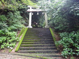 鳥居を潜り石段を上って行くと、夏草が綺麗に刈り取られたグリーンの世界。その中で中宮神社の拝殿が一際明るく光っていた。ここで下宮神社に引き続き2度目の参拝をした。 |