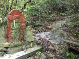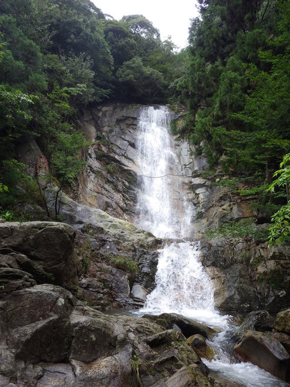 ここ三日間降り続く雨の影響で水量がかなり多い。もはや「白糸」ではない! 滝の飛沫で全身があっという間にびしょ濡れだ。もの凄い音を立てて流れ落ちる滝を、「不動明王」が滝の中程、左側から睨みつけている。何かちょっと怖いような・・そんな感じを受けた。 |