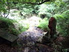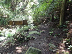 鳥野神社への分岐を通過 11時50分 登山道を上り、鷹取山山頂に程近い所に分岐がある。注意していないと見過ごしてしまうが、ここから内ヶ磯ダムの鳥野神社に続く。 目印の岩 |