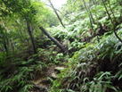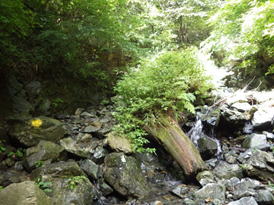 ここから少し下ると林道に出る。その林道を横切りまた登山道を進むことになるが、かなりの急坂で滑りやすく注意が必要だ!急坂を下って行くと程なく沢に出る。ルートはこの沢沿いに下って行くのだが、ルートをよく確認しないと「アレっ、どっち?」と言うことになる。岩に印された黄色のペンキがとても有り難い。見逃さないようにしよう! |