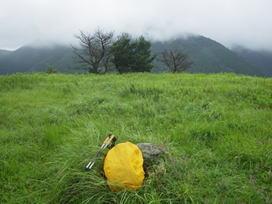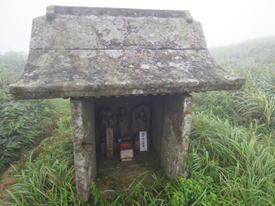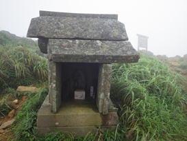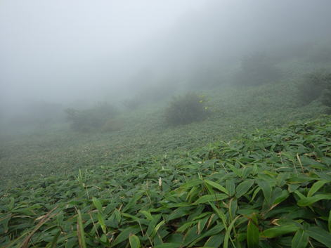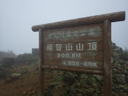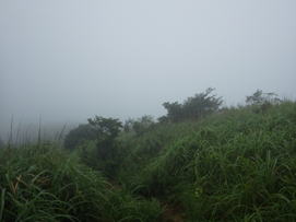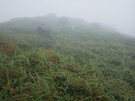 本来なら正面に福智山の山頂を見ながら歩く場面だが、濃霧で福智山の姿は全く見えない。足下の花の撮影をしながら、どこを歩いているのかもよくわからず進んでいると・・気が付けば八丁の辻を通り過ぎてクマザサ帯の横を歩いていた。やはり霧は感覚を鈍らせる。「もう少しで山頂だろう」と思った瞬間に福智神社上宮が目の前に現れた! |