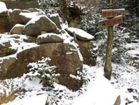 虎尾桜の分岐を通過 13時26分 順調に下山してきた。左手に虎尾桜へ続く道がある。虎尾桜までここから5分だ。 春は混雑 |