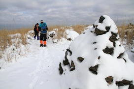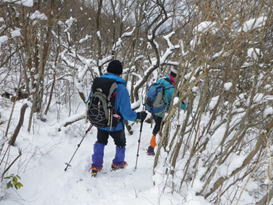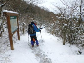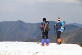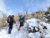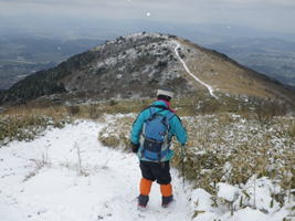 福智山に向かう 10時20分 福智山頂が目の前に現れると、これまでの急登の疲れもすっかり忘れて元気が涌いてきた。 無風で穏やかな気候に恵まれ、八丁から福智山頂までの道中は、美しい雪景色、遠くの山並み、下界の景色を堪能しながらゆっくりと歩くことが出来た。 この安堵感、充実感、解放感の中で歩くスローな時間が実に楽しい。 |